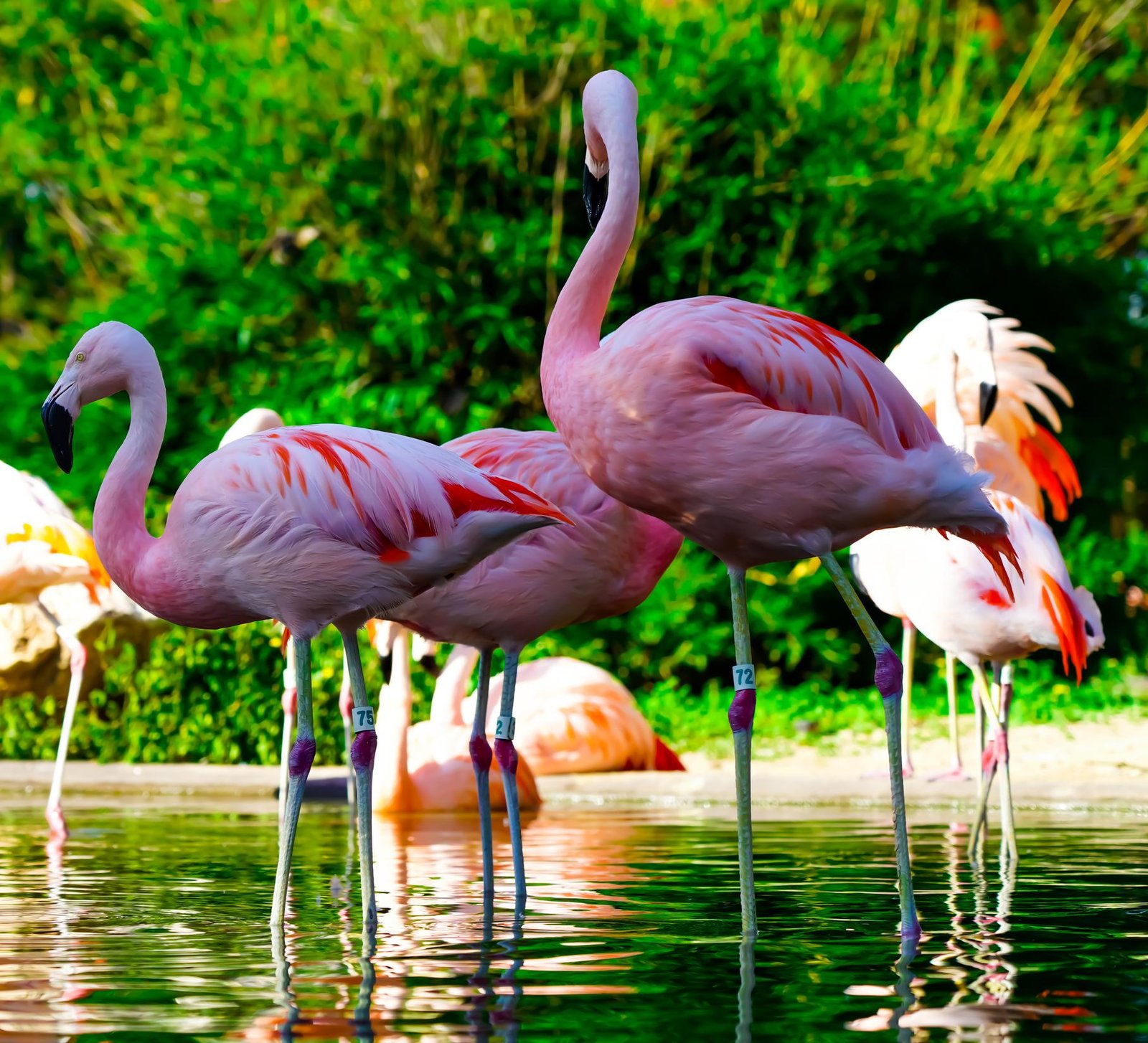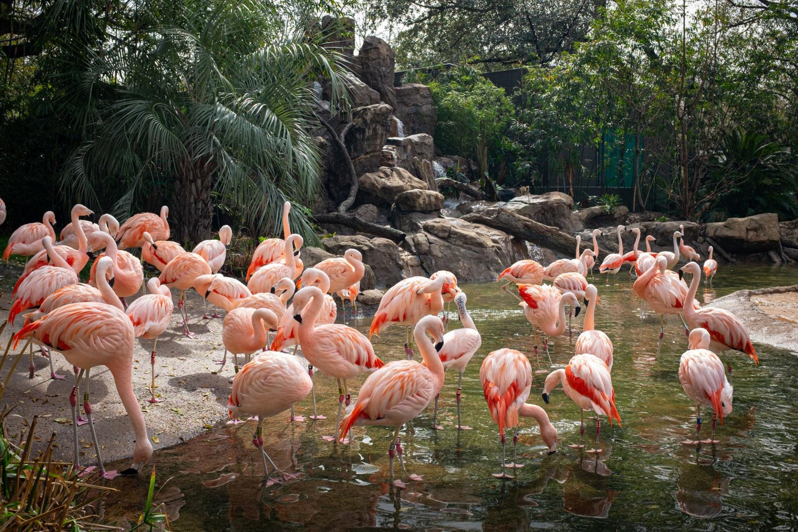 The Houston Zoo features a vibrant flock of Chilean flamingos in a lush wetland-style habitat. Their bright pink feathers and active social behavior make them a favorite stop for visitors exploring the zoo’s South America exhibits.